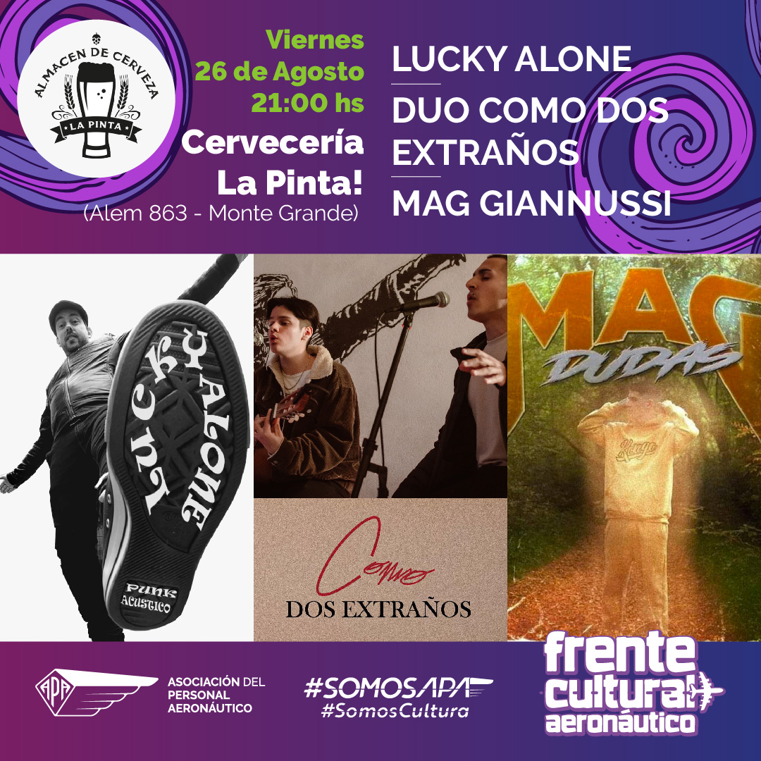Tenemos el agrado de invitarles a disfrutar una gran noche donde van a estar presentando su material LUCKY Alone, el duo Como dos extraños! brindándonos un show musical imperdible y Mag Giannussi presentando nuevo material DUDAS