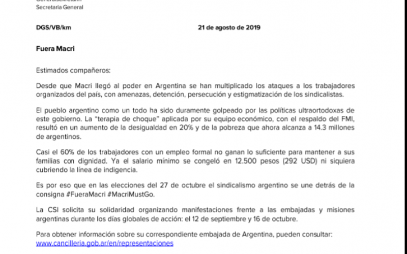 FUERA MACRI – Resolución de la Confederación Sindical Internacional