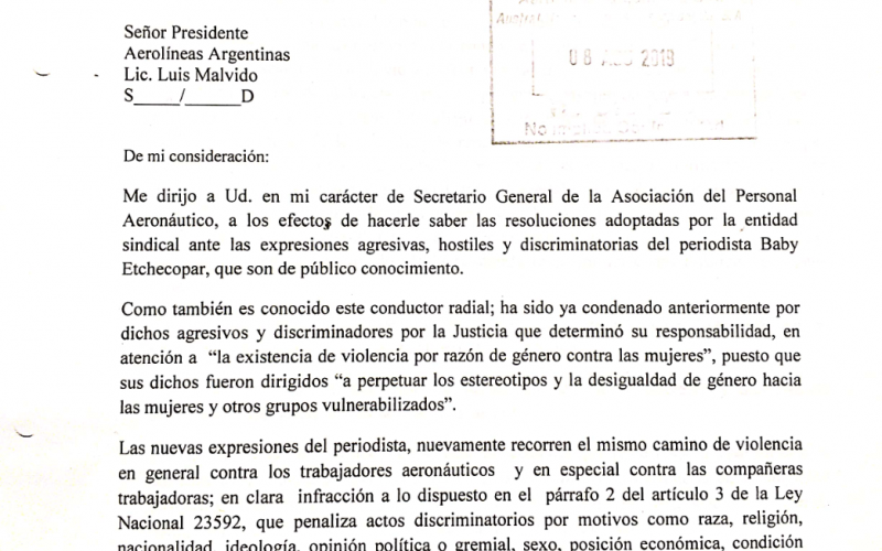 CARTA DE APA A AEROLÍNEAS ARGENTINAS POR EL DISCRIMINADOR BABY ETCHECOPAR