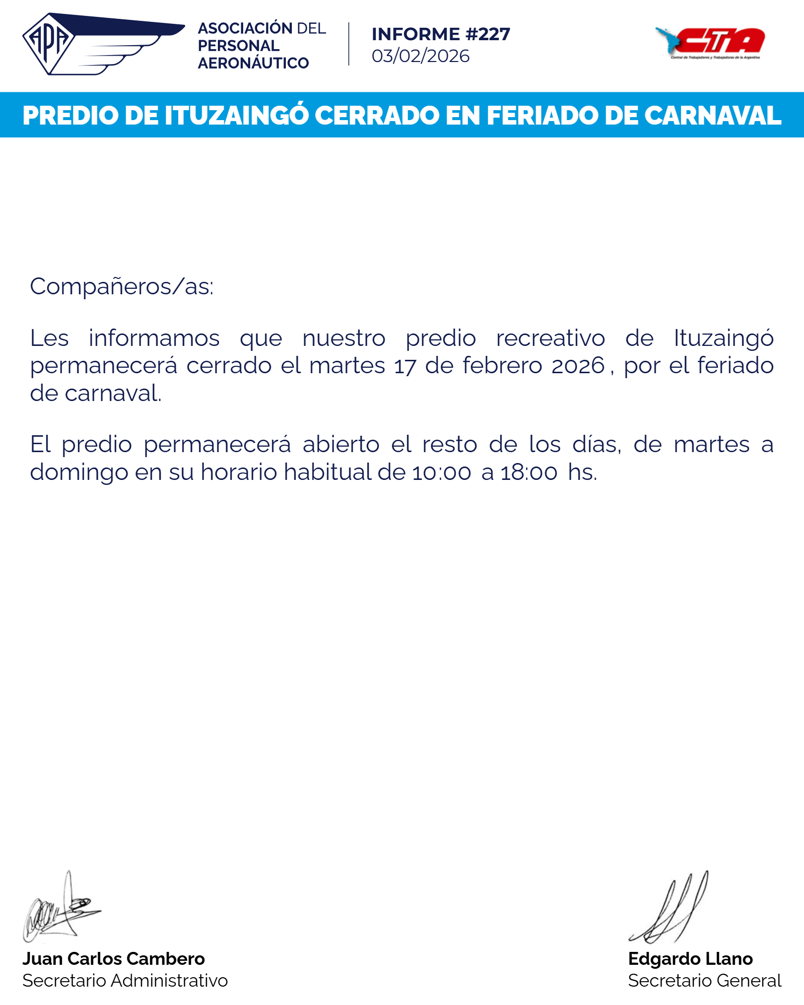 Les informamos que nuestro predio recreativo de Ituzaingó permanecerá cerrado el martes 17 de febrero 2026, por el feriado de carnaval.